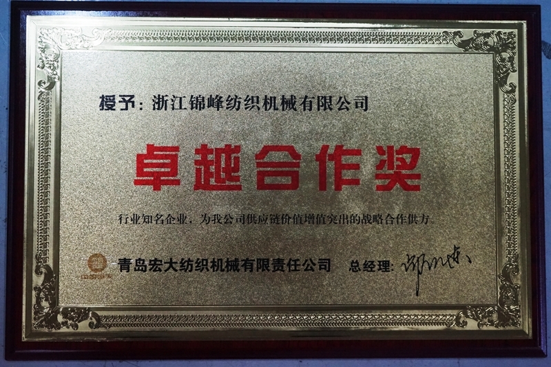 浙江锦峰同青岛宏大精诚合作,密切沟通,协同发展,是青岛宏大对双方合作六年来取得的成果肯定,青岛宏大纺织机械有限责任公司评定“卓越合作奖”得主认定为:“行业知名企业,为我公司供应链价值突出的战略合作方”。标志浙江锦峰纺织机械有限公司成为青岛宏大众多供应商优秀典范。