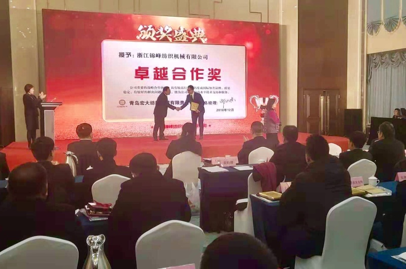 浙江锦峰纺织机械有限公司作为青岛宏大最重要的战略合作伙伴,具有很高行业知名度,为青岛宏大提供高水平技术支持和服务。浙江锦峰纺织机械有限公司等5家荣获青岛宏大2019年战略采购会议最高奖——“卓越合作奖”。青岛宏大邵明东总经理亲自为浙江锦锋纺织机械有限公司颁奖,和浙江锦峰纺织机械有限公司戴羡磊总经理并在主席台合影,留下美好合作见证。